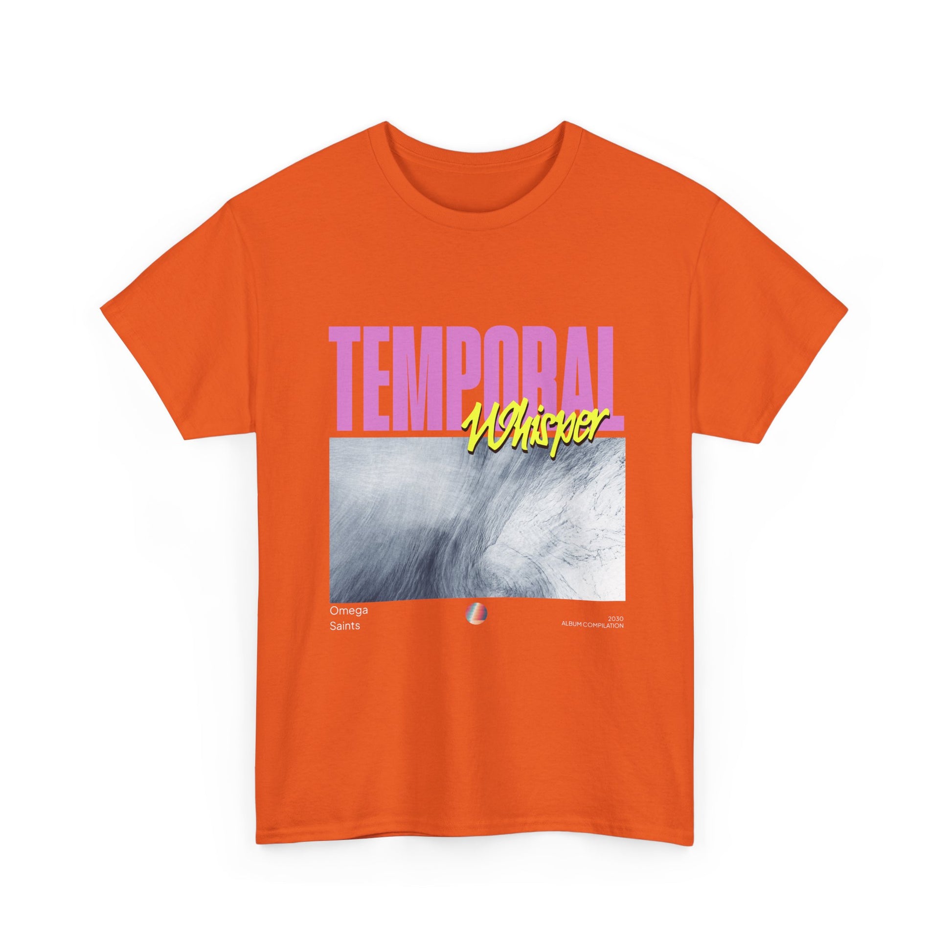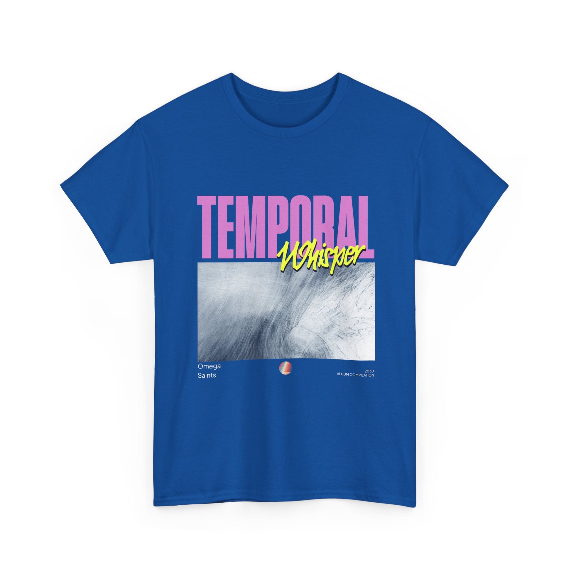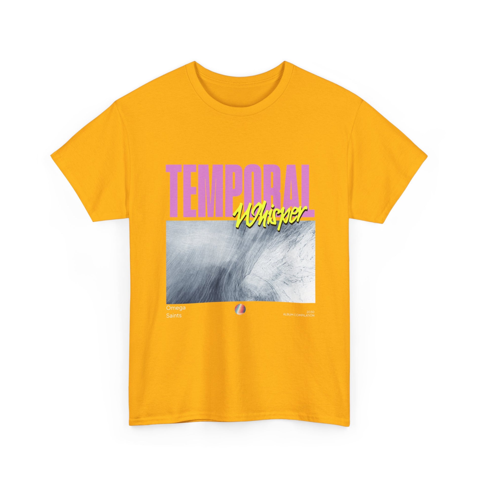 The oversized “Temporal” headline in pastel pink collides with electric yellow script, layered over a dreamlike, glacial wave texture—evoking late-night drives, lost mixtapes, and distant futures. Finished with subtle “Omega Saints” and “2030 Album Compilation” details, this tee feels like merch from a record that hasn’t dropped yet.